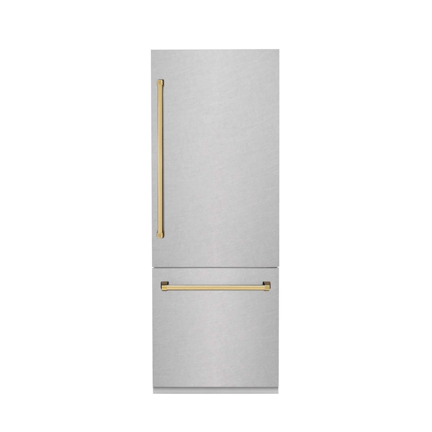 ZLINE 30 in. Autograph Edition 16.1 cu. ft. Built-in 2-Door Bottom Freezer Refrigerator with Internal Water and Ice Dispenser in Fingerprint Resistant Stainless Steel with Polished Gold Accents (RBIVZ-SN-30-G)