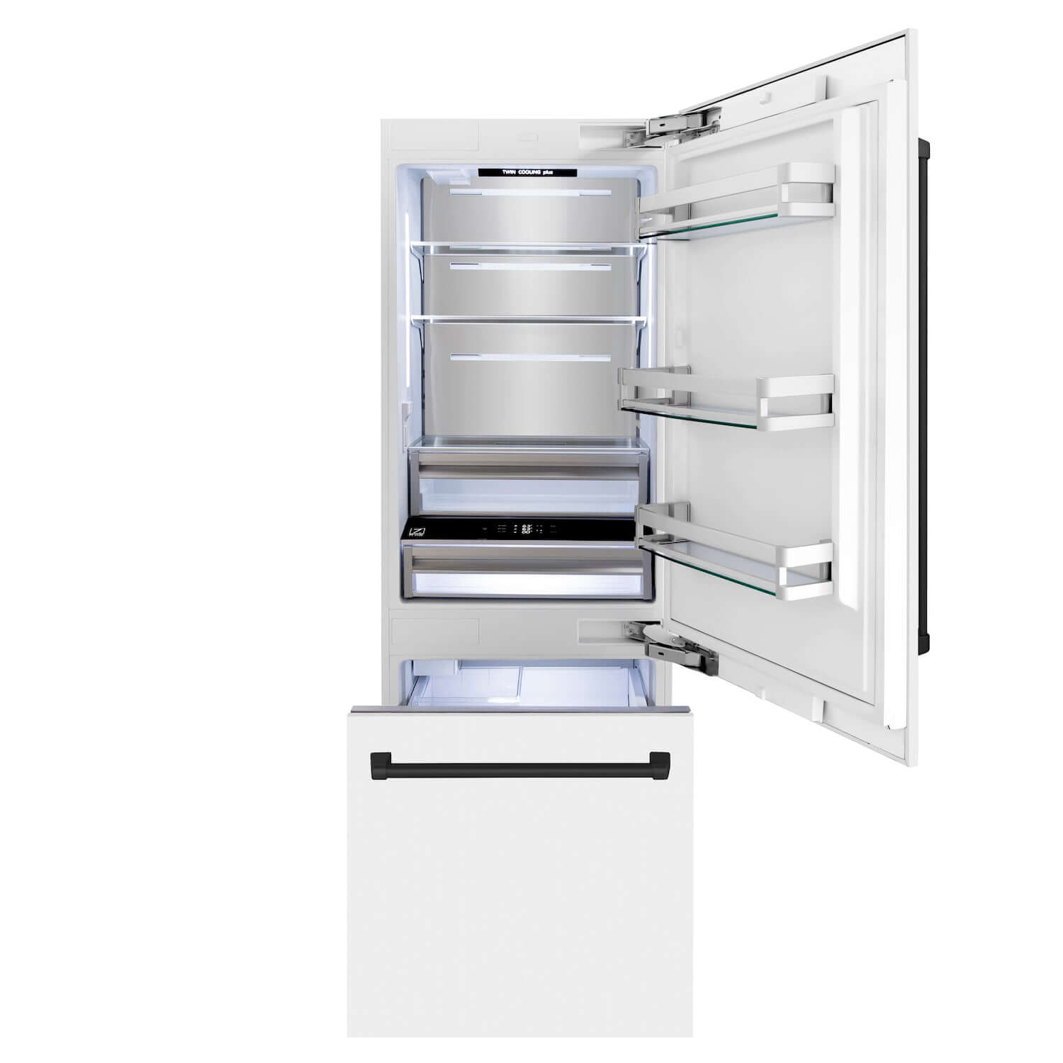 ZLINE 30 in. Autograph Edition 16.1 cu. ft. Built-in 2-Door Bottom Freezer Refrigerator with Internal Water and Ice Dispenser in White Matte with Matte Black Accents (RBIVZ-WM-30-MB)