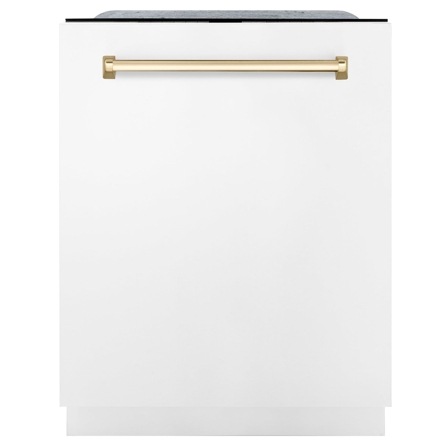 ZLINE Autograph Edition 24 in. 3rd Rack Top Touch Control Tall Tub Dishwasher in White Matte with Polished Gold Accent Handle, 45dBa (DWMTZ-WM-24-G)
