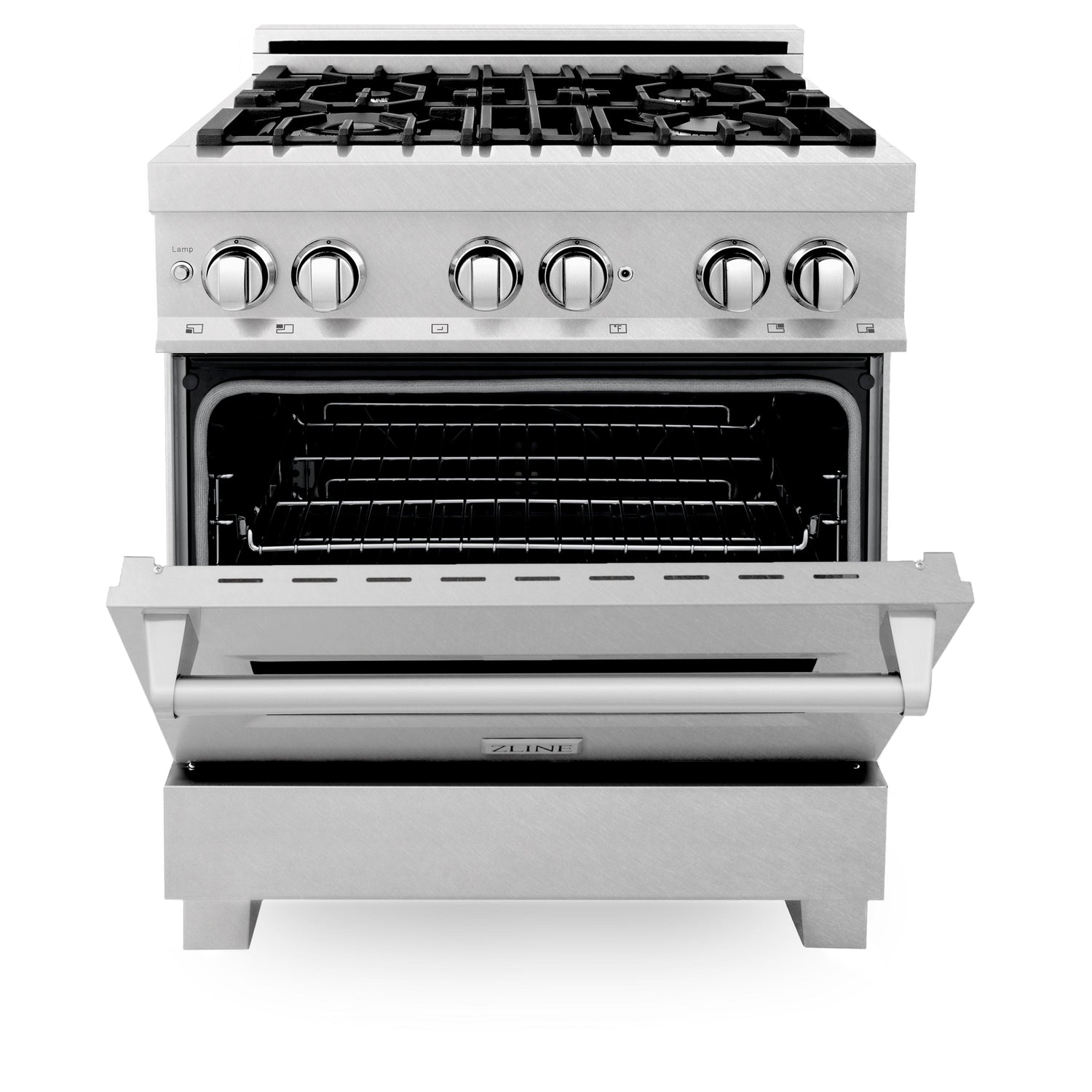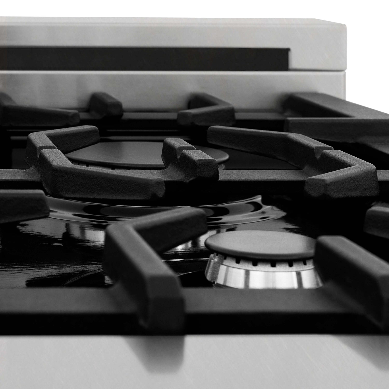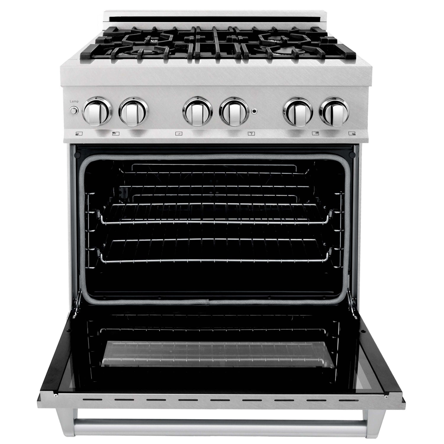 - Description: Experience Attainable Luxury® with the ZLINE 30" DuraSnow® Dual Fuel Professional Range. ZLINE’s dual fuel range combines a high performance gas stovetop with an electric convection oven. Providing both professional aesthetics and functionality, this dual fuel stove provides the ultimate luxury experience for a fraction of the cost. ZLINE’s exclusive DuraSnow® finish features a timeless non-directional fingerprint-resistant finish, allowing you to easily combat everyday wear and tear. Achieve optimal results with cooktop cooking power from 4,200 up to 18,000 BTUs provided with sealed burners. Rely on precise and even heating for every homemade dish with an electric convection oven. Enjoy an ultra-deep oven capacity with a three-layered insulated glass oven for efficient cooking every use. With upgraded premium features such as SmoothSlide ball-bearing oven racks, dual lighting, and adjustable legs, this range is certain to wow both the chef and guests alike. Assembled with the highest quality materials on the market, this range offers a durable, scratch-resistant porcelain cooktop and ZLINE’s exclusive single piece cast iron grate. Cook with ease with StayPut Italian hinges, providing a safe baking environment to enjoy for years to come. ZLINE stands by the longevity and durability of their professional dual fuel stoves, while ensuring further protection and peace of mind with a worry-free warranty. The ZLINE Dual Fuel Range is packaged in multiple boxes and will ship out together next business day when in stock.