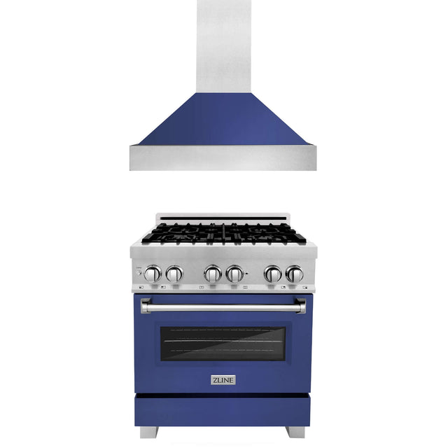 ZLINE 30 in. Kitchen Package with DuraSnow Stainless Steel Dual Fuel Range with Blue Matte Door and Convertible Vent Range Hood (2KP-RASBMRH30)