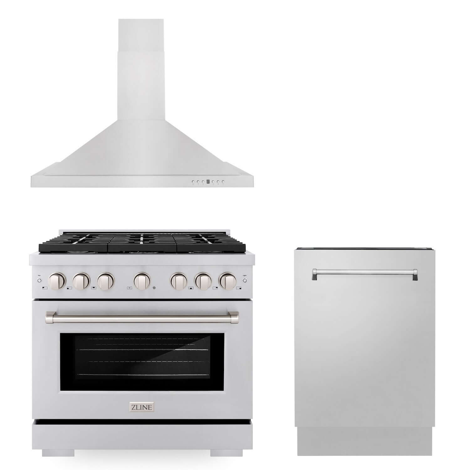 ZLINE 36 in. Kitchen Package with Stainless Steel Gas Range, Convertible Vent Range Hood and Tall Tub Dishwasher (3KP-SGRRH36-DWV)