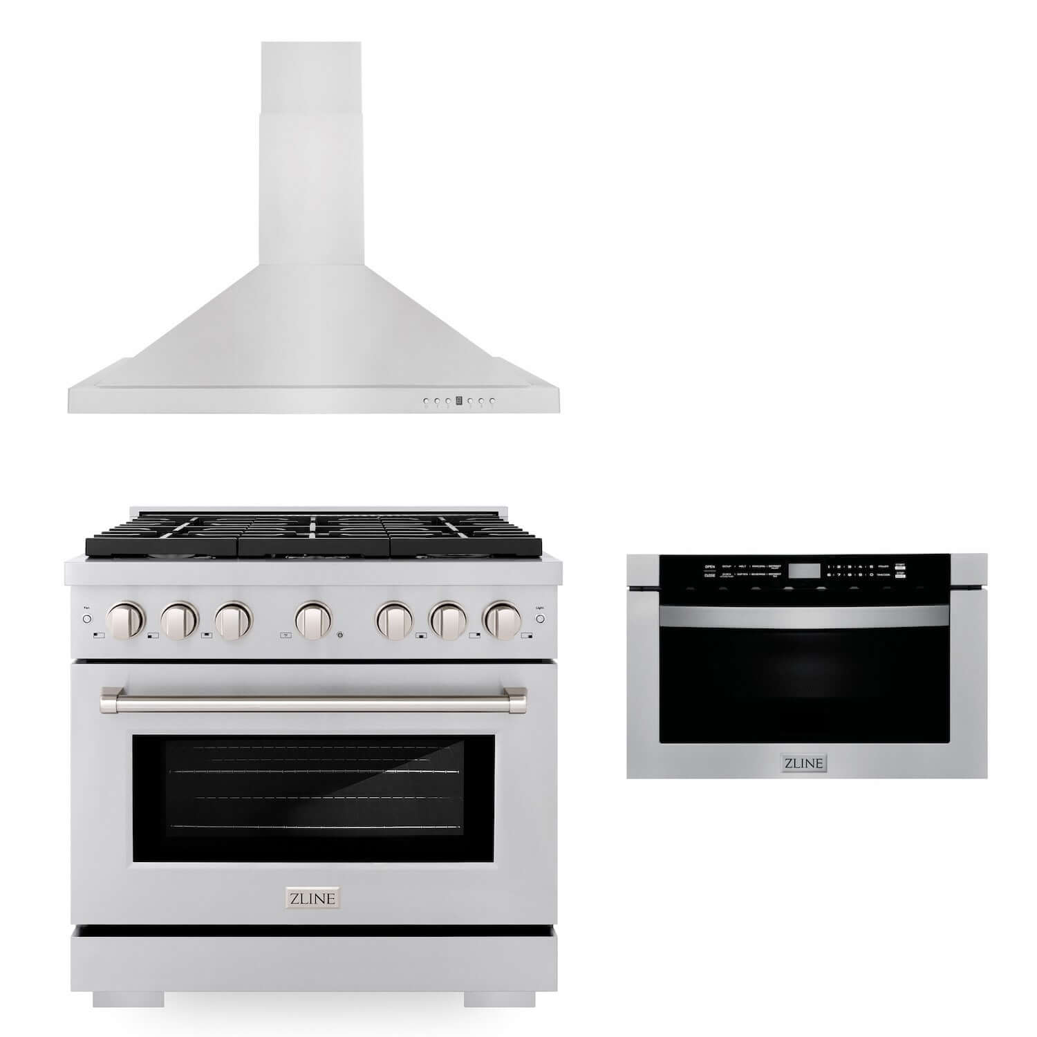 ZLINE 36 in. Kitchen Package with Stainless Steel Gas Range, Convertible Vent Range Hood and Microwave Drawer (3KP-SGRRH36-MW)