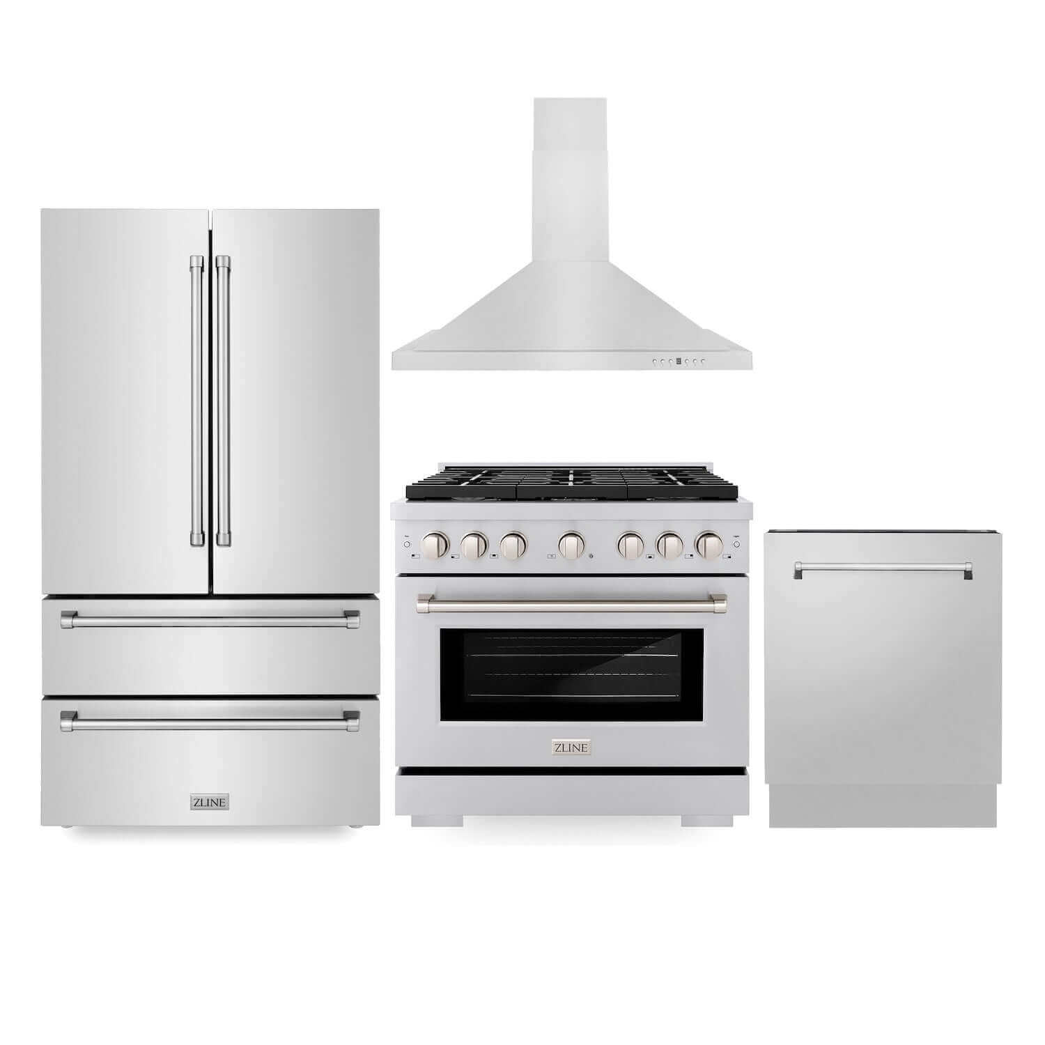 ZLINE Kitchen Package with Refrigeration, 36 in. Stainless Steel Gas Range, 36 in. Convertible Vent Range Hood and 24 in. Tall Tub Dishwasher (4KPR-SGRRH36-DWV)