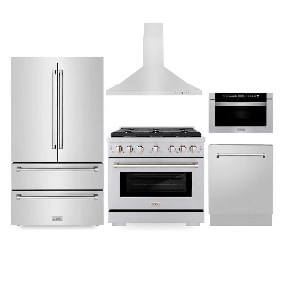 ZLINE Kitchen Package with 36 in. French Door Refrigerator, 36 in. Stainless Steel Gas Range, 36 in. Range Hood, 24 in. Microwave Drawer, and 24 in. Tall Tub Dishwasher (5KPR-SGRRH36-MWDWV)