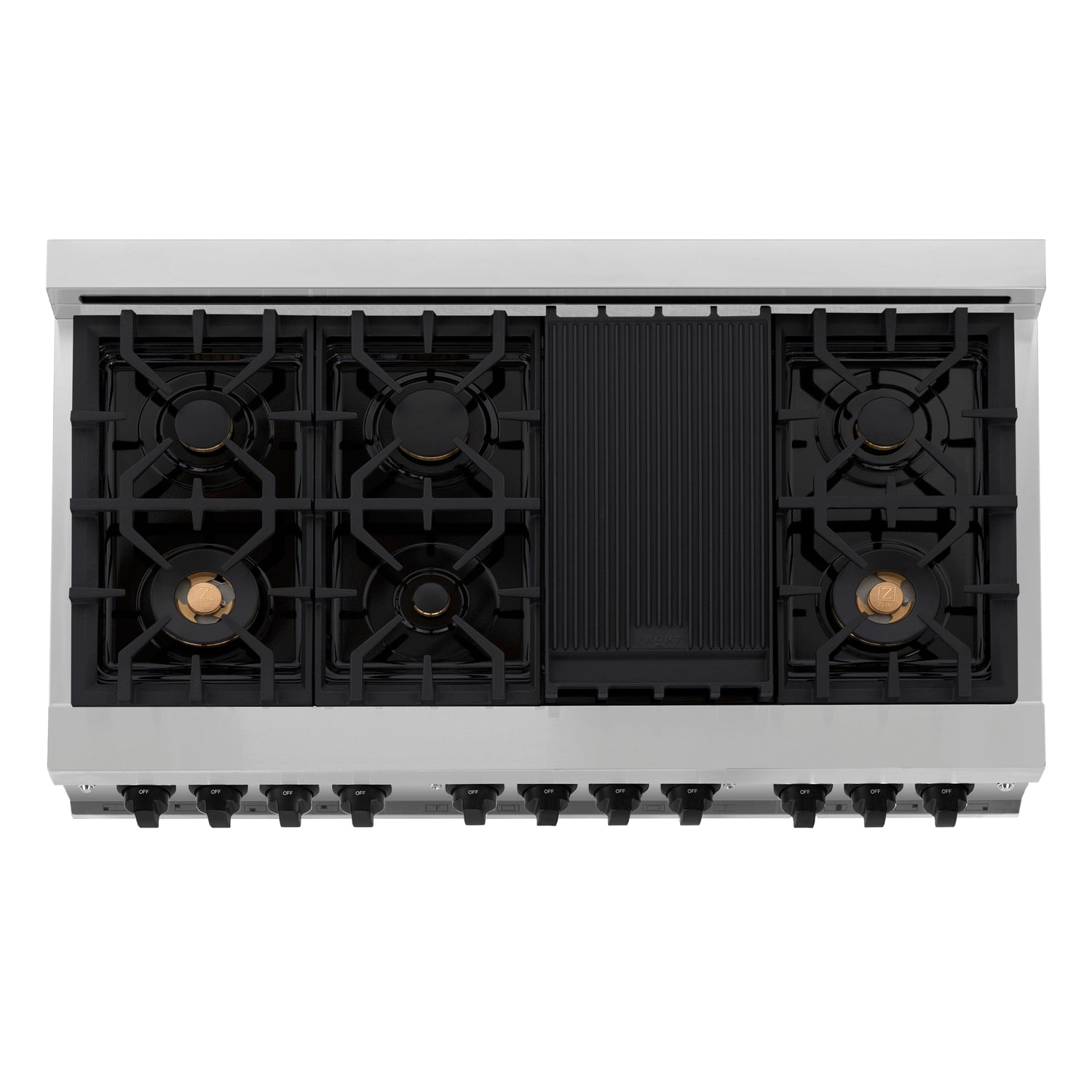 - ZLINE Autograph Edition 48 in. 6.0 cu. ft. Dual Fuel Range with Gas Stove and Electric Oven in Stainless Steel with Accents (RAZ-48-MB)