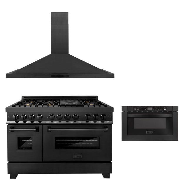 ZLINE 48 in. Kitchen Package with Black Stainless Steel Dual Fuel Range, Convertible Vent Range Hood and Microwave Drawer (3KP-RABRH48-MW)