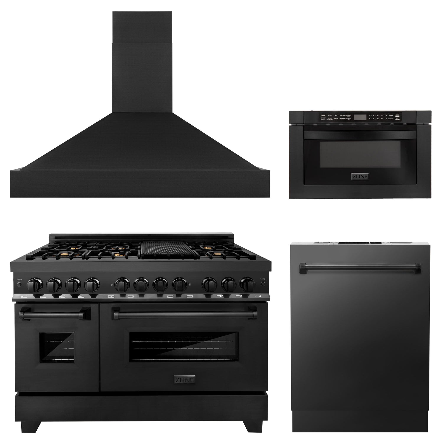 ZLINE 48 in. Kitchen Package with Black Stainless Steel Dual Fuel Range, Range Hood, Microwave Drawer and Dishwasher(4KP-RABRH48-MWDW)