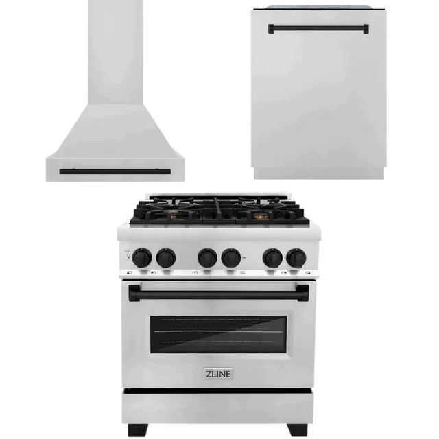 ZLINE 30 in. Autograph Edition Kitchen Package with Stainless Steel Dual Fuel Range and Range Hood with Matte Black Accents (3AKP-RARHDWM30-MB)