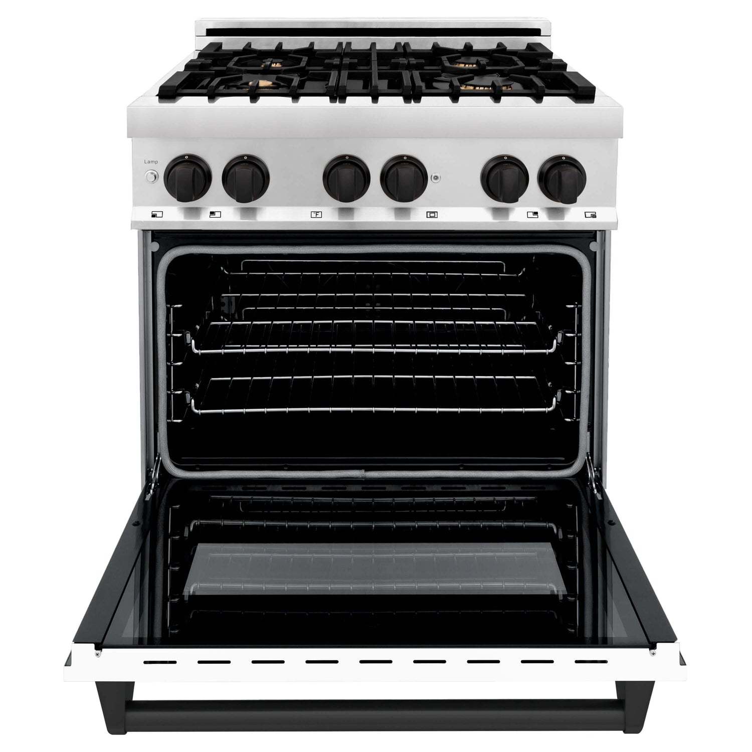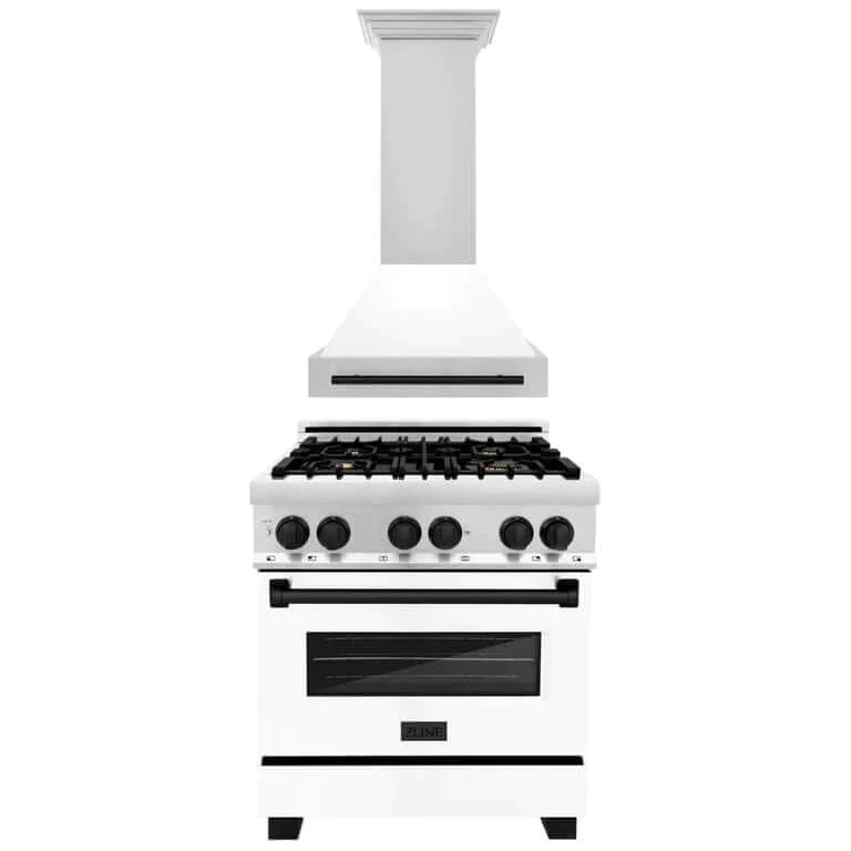 ZLINE 30 in. Autograph Edition Kitchen Package with Stainless Steel Dual Fuel Range with White Matte Door and Range Hood with Matte Black Accents (2AKP-RAWMRH30-MB)