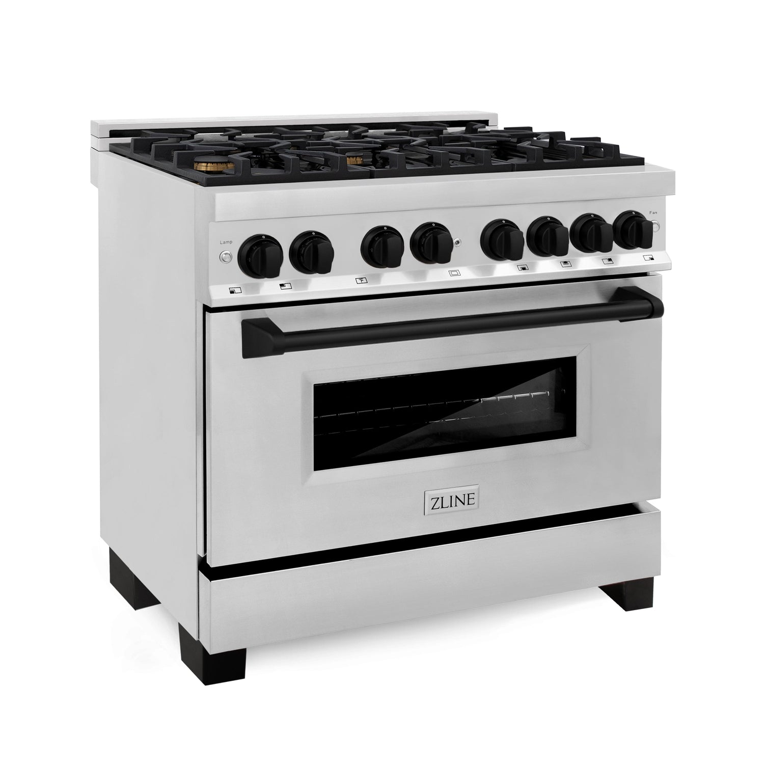 - ZLINE Autograph Edition 36 in. 4.6 cu. ft. Dual Fuel Range with Gas Stove and Electric Oven in Stainless Steel with Matte Black Accents (RAZ-36-MB)