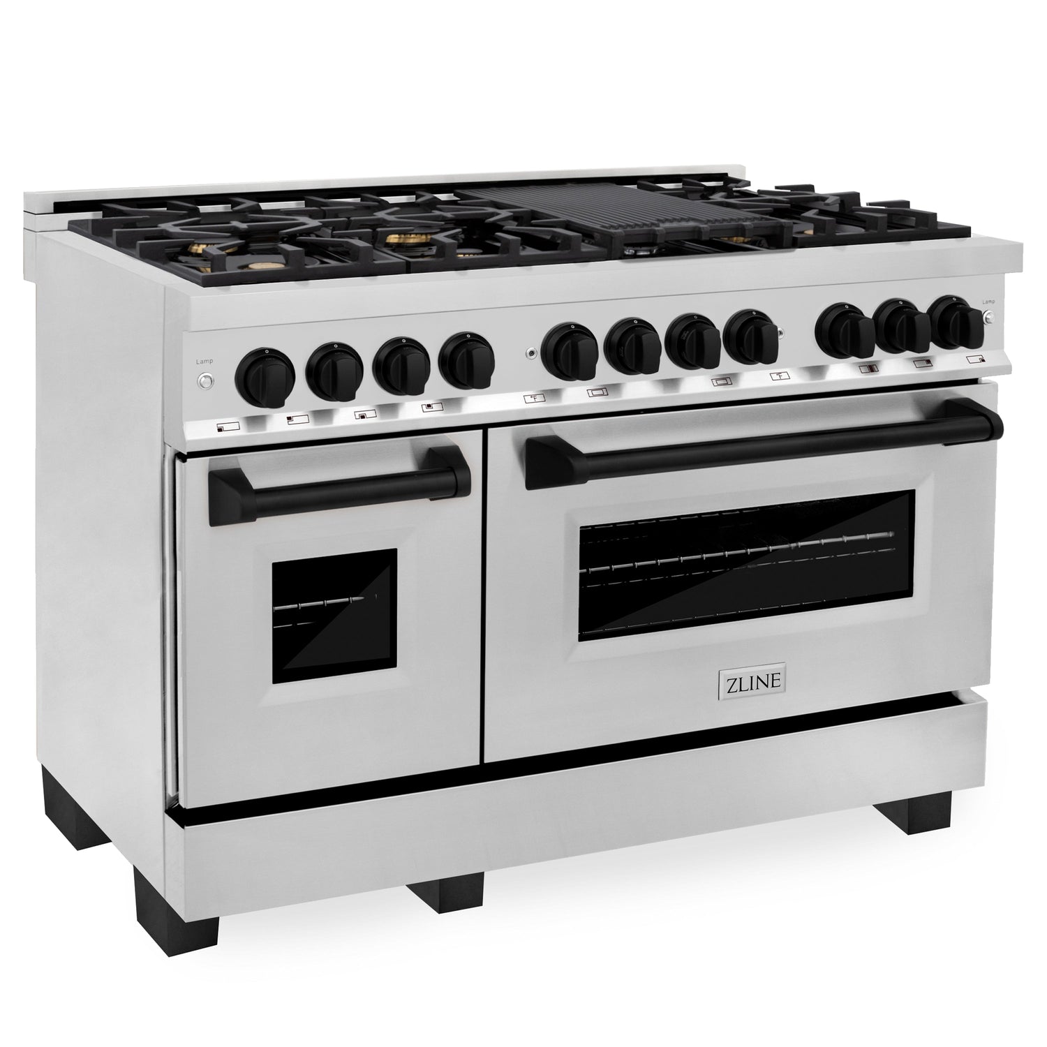 - ZLINE Autograph Edition 48 in. 6.0 cu. ft. Dual Fuel Range with Gas Stove and Electric Oven in Stainless Steel with Matte Black Accents (RAZ-48-MB)