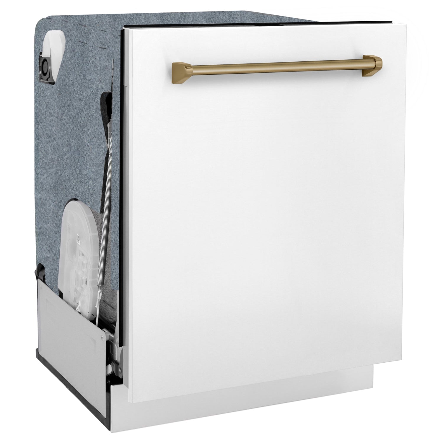 ZLINE Autograph Edition 24 in. 3rd Rack Top Touch Control Tall Tub Dishwasher in White Matte with Champagne Bronze Accent Handle, 45dBa (DWMTZ-WM-24-CB)