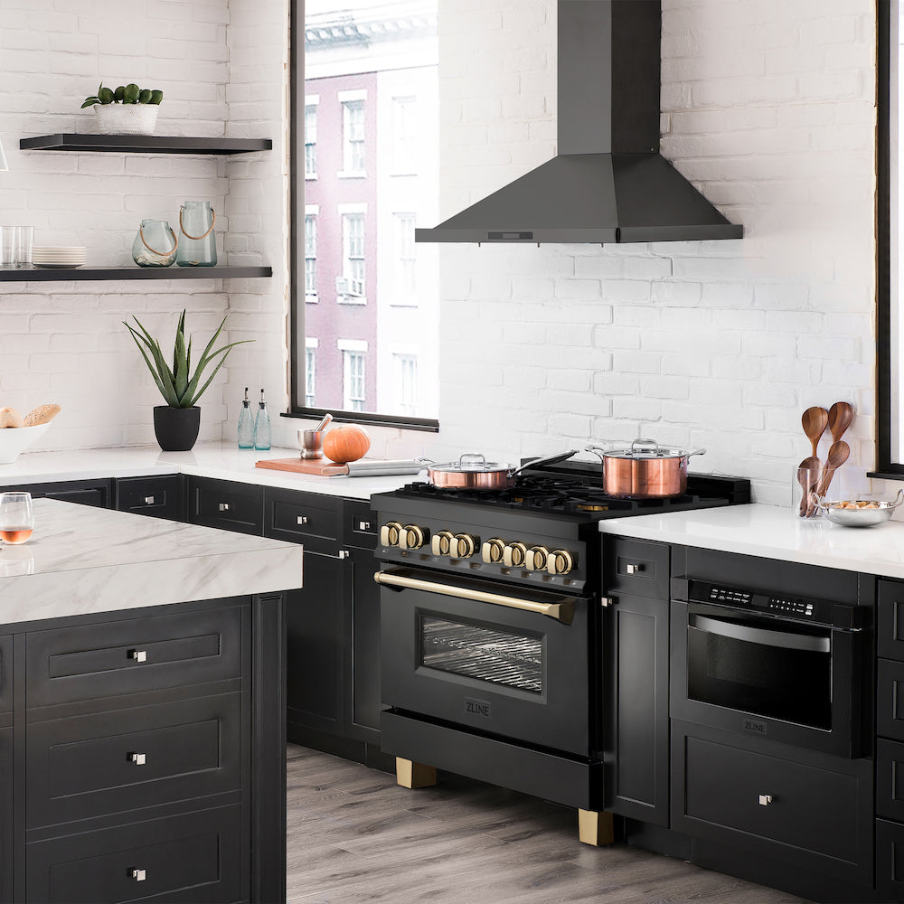 - Autograph Edition Series - Enjoy a timeless look in your kitchen with a Black Stainless Steel finish paired with Polished Gold accent knobs and handles, giving your kitchen an elegant, unmatched style