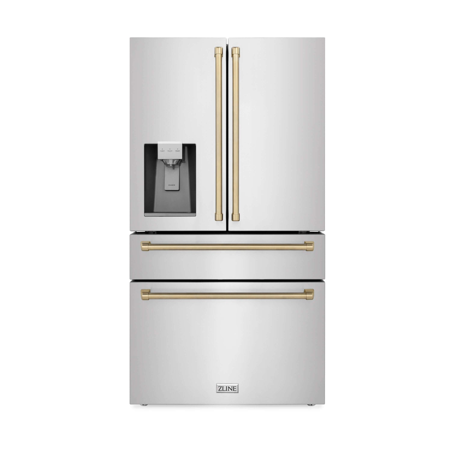 - ZLINE 36 in. Autograph Edition 21.6 cu. ft Freestanding French Door Refrigerator with External Water and Ice Dispenser in Fingerprint Resistant Stainless Steel with Champagne Bronze Accents (RFMZ-W-36-CB)