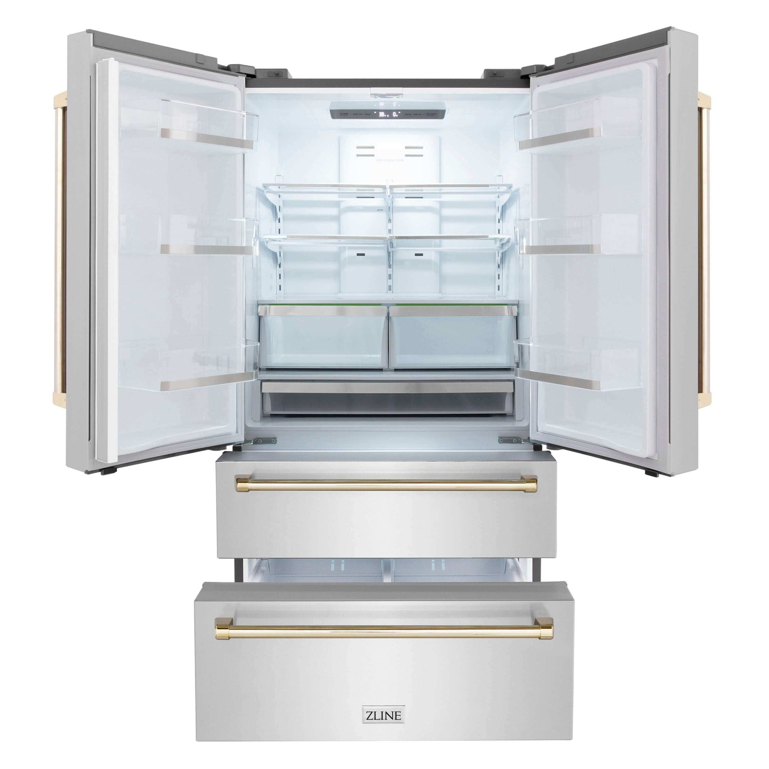 - ZLINE 36 in. Autograph Edition 22.5 cu. ft Freestanding French Door Refrigerator with Ice Maker in Fingerprint Resistant Stainless Steel with Polished Gold Accents (RFMZ-36-G)